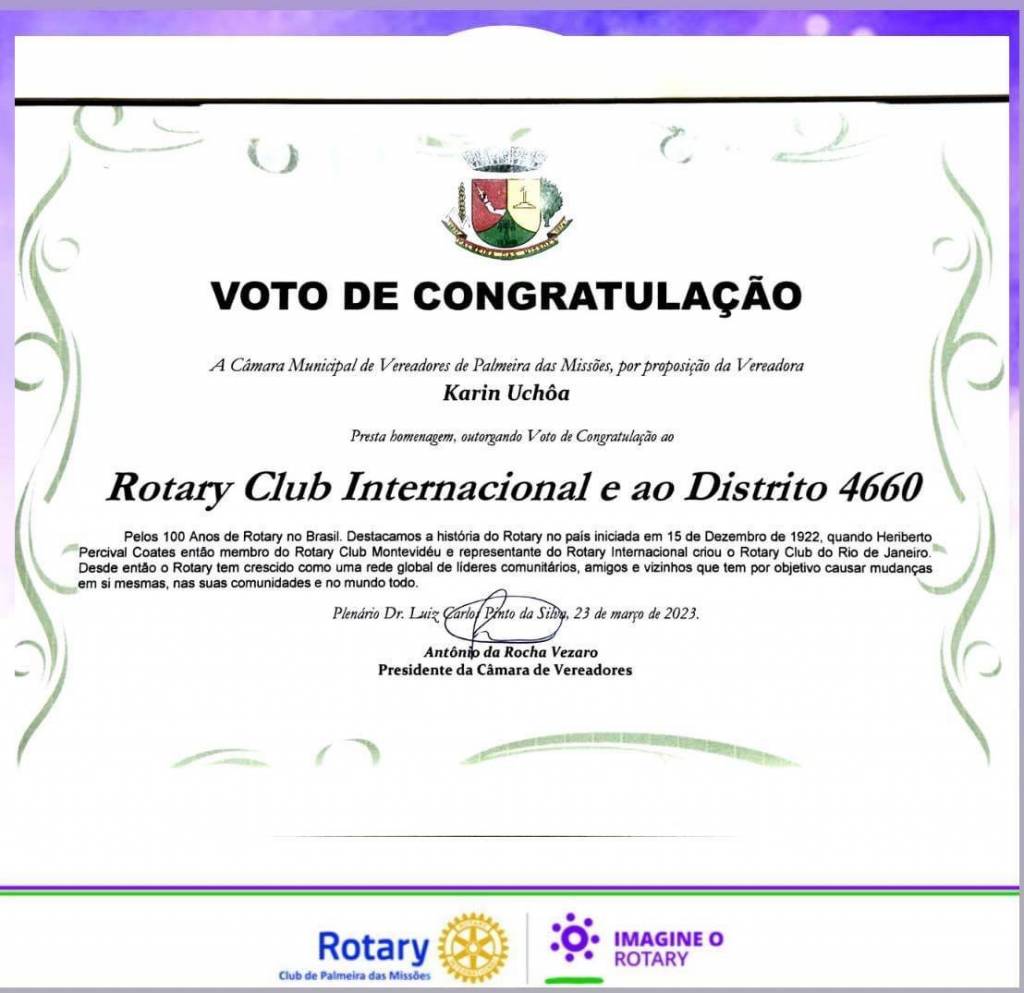 Na noite de ontem (23), a vereadora Karin Uchoa prestou homenagem com o Voto de Congratulação em nome da Câmara de Vereadores de Palmeira das Missões pelos 100 anos de Rotary no Brasil. Agradecemos está homenagem que muito nos orgulha.