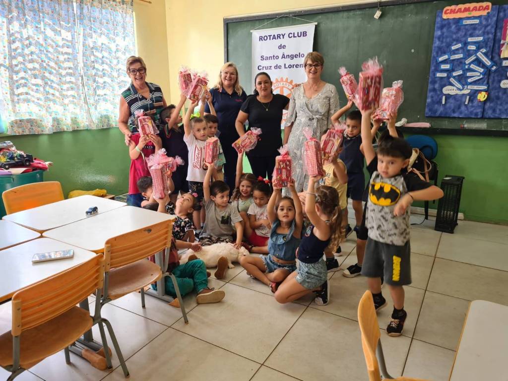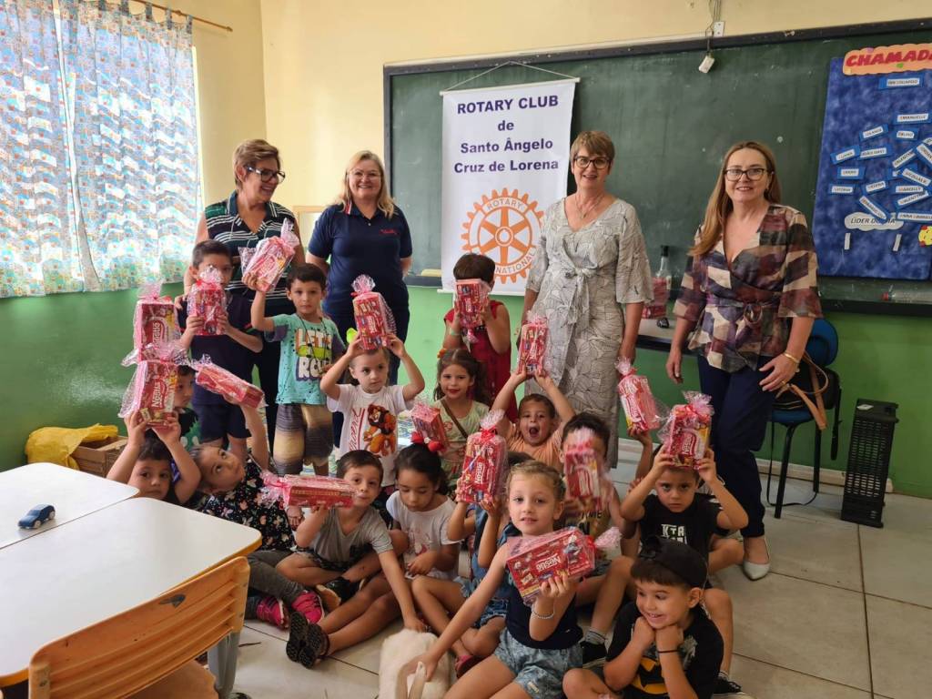 Dia 31 de março o Rotary Clube de Santo Ângelo Cruz de Lorena representado pela presidente Normali Iven, juntamente com as companheiras Vera Henke, Vanila Obadowski e Sônia Melchior entregaram os doces de Páscoa para 20 crianças da EMEF Margarida Pardelhas. Foram recebidas pela Diretora Sandra Lemos, Prof. Tatiana e Coordenadora Pedagógica Natália Bomfim. A alegria das crianças foi contagiante e emocionante. Estava presente também o 🐇, que não podia faltar.