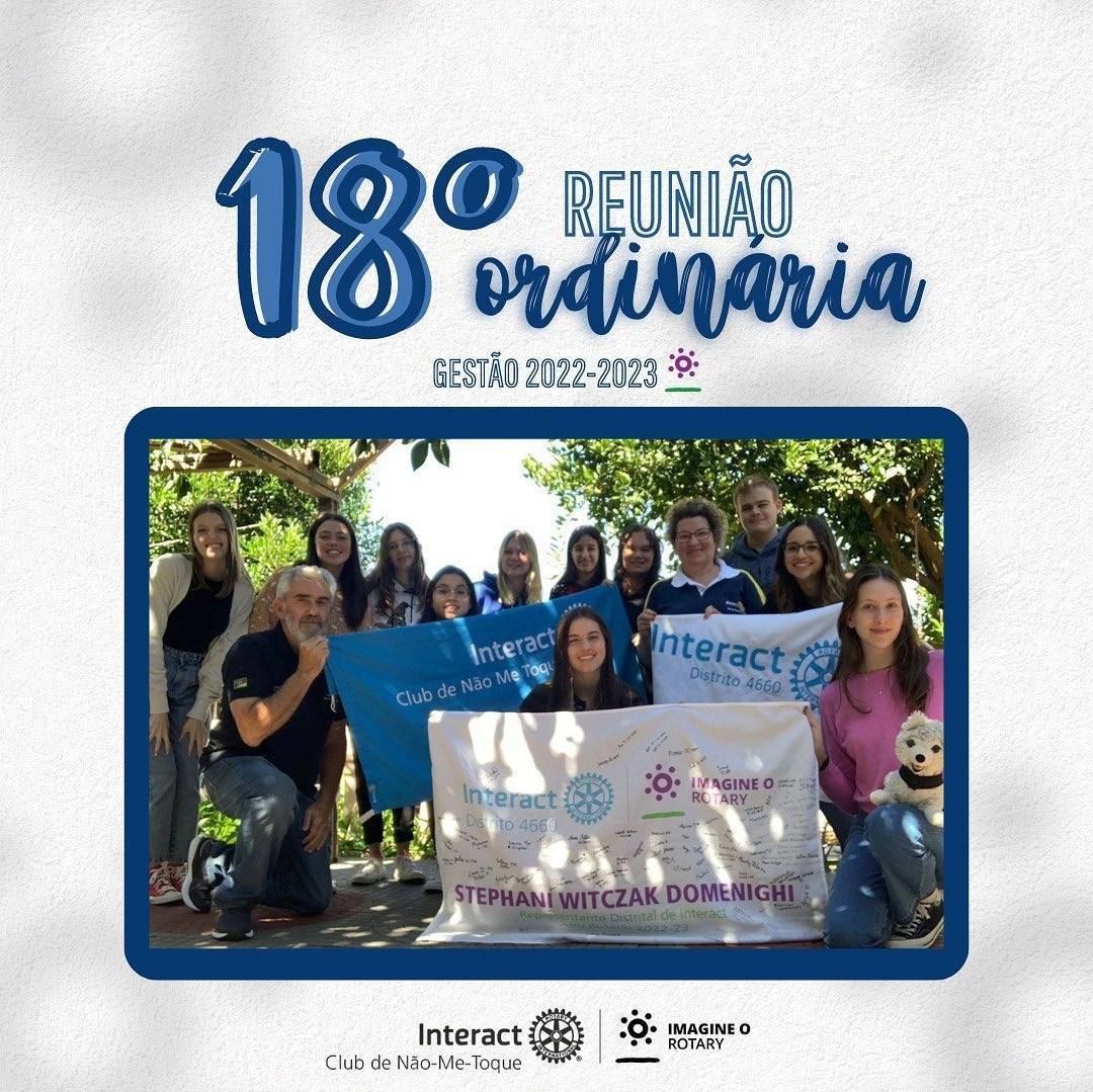 Na tarde de domingo do dia 02/04/2023 tivemos o prazer de receber a visita distrital da Stephani Domenighi e do Edson Tussi, aém de realizar a décima oitava reunião ordinária do Interact Club de Não-Me-Toque. Na reunião estiveram presentes os associados do clube, a Representante Distrital do Interact, o Diretor de Novas Gestões, contando também com a presença da rotariana Carla Van Riel. Durante a reunião terminamos de planejar os nossos próximos projetos, sendo eles a venda de sacolé no Animetoque, que aconteceu na tarde do mesmo dia, o projeto de páscoa e o projeto junto com a APAE do município. Além disso, conversamos sobre a situação do clube, ideias de projetos, próxima gestão e conselhos dos visitantes para todos os companheiros.