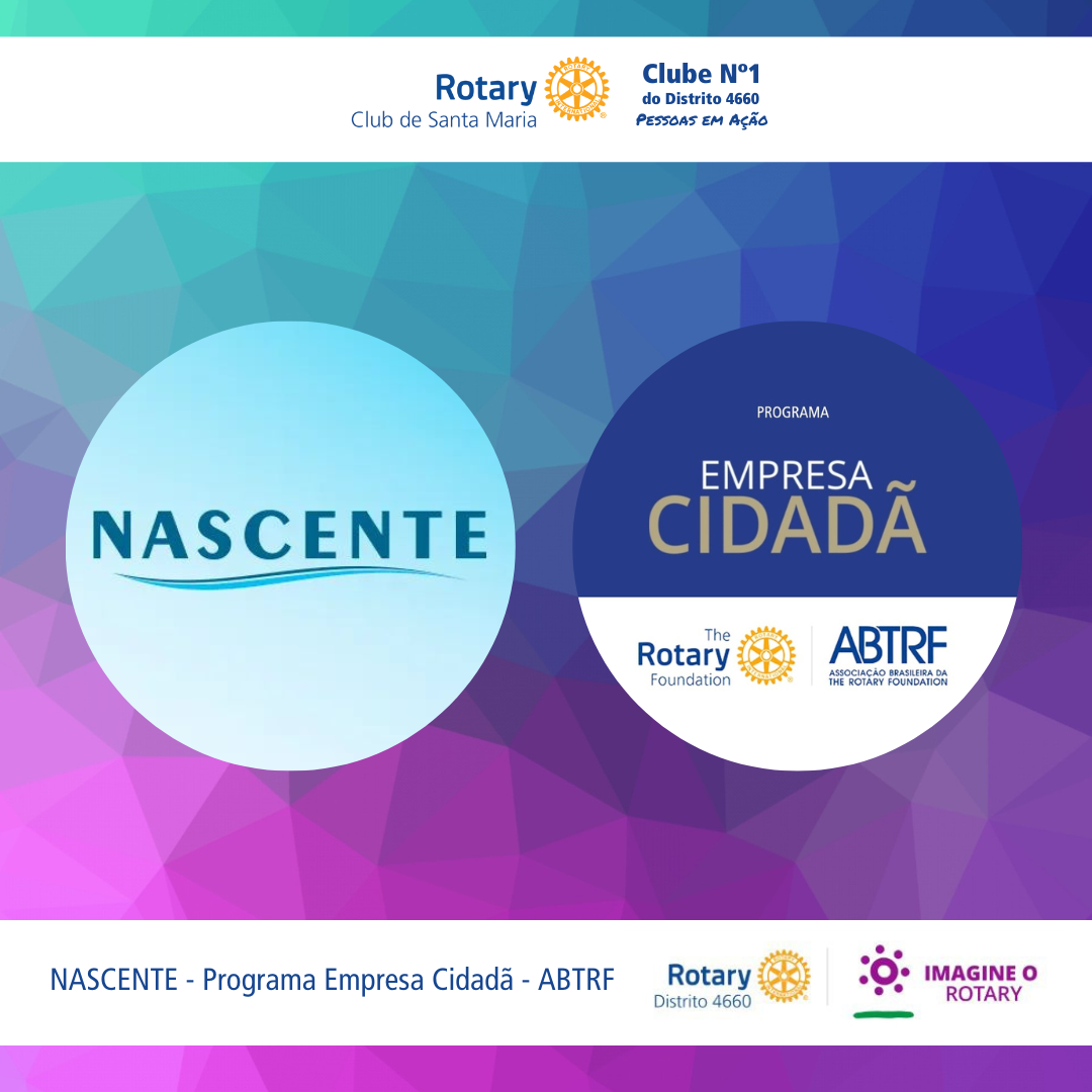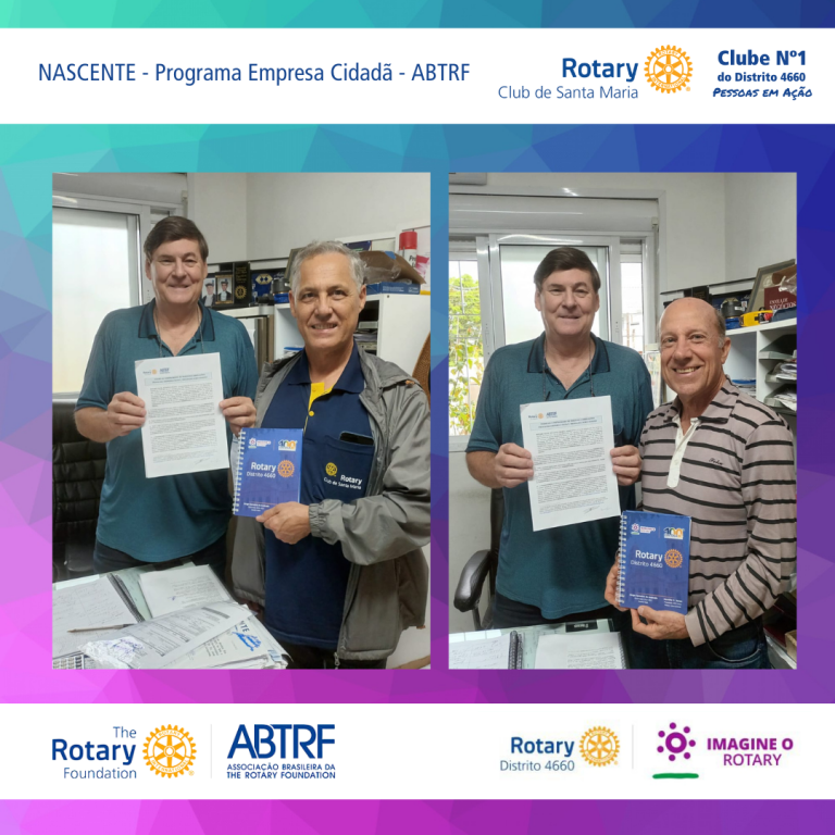O Rotary Club de Santa Maria representado pelo Pres. Bonifácio Konzen e o diretor da FR Anselmo Mortari acompanhados pelo Gov. Assistente do Distrito 4660 da Área 2, João Francisco Estula e os companheiros Valdir Sauer e Alvaro Stolz, representantes da ABTRF do Distrito 4660 fizeram uma visita à empresa Nascente, para apresentar o Programa Empresa Cidadã da ABTRF, na ocasião o seu diretor, Sr. Claudio Schmitt viu no Programa que investir em responsabilidade corporativa aumenta o impacto que sua empresa poderá causar na sociedade. Então no dia 25 de abril firmamos o termo de adesão ao Programa Empresa Cidadã da ABTRF da empresa Nascente, que atua em Santa Maria/RS desde 1997 na perfuração de poços artesianos, limpeza e higienização de reservatórios de água.
