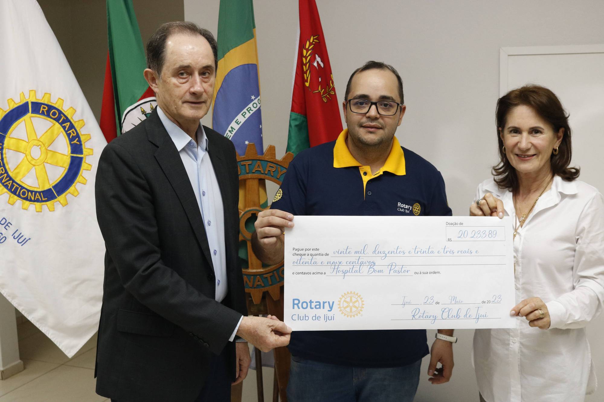 Na última terça feira, 16/05, aconteceu na sede do Rotary Club de ijuí, a doação dos valores arrecadados pelo 52° Baile do Chopp. Na ocasião estiveram presentes os representantes do Hospital Bom Pastor, entidade beneficiada, o presidente, sr Nilo Leal e a diretora executiva, sra Rosane Schiavo. O valor arrecadado foi de R$ 20.233,89 que será destinado à compra de instrumentos para o Centro Cirúrgico e na UTI Geral Adulto.