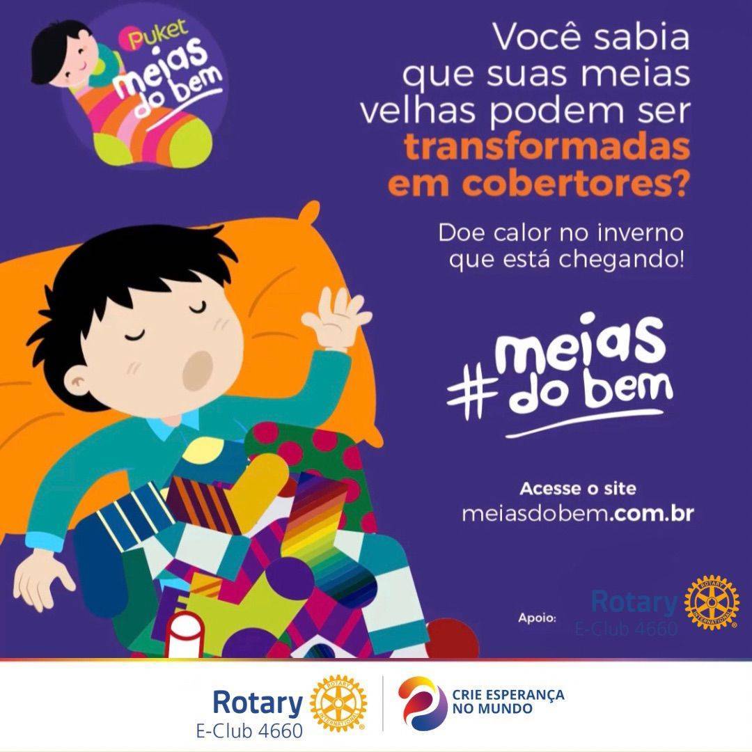 O ROTARY E-CLUB 4660 é oficialmente parceiro e entidade recebedora da campanha ‘Meias do Bem’ da marca Puket! Procure os rotarianos do clube e saiba como doar as meias que não usa mais ou estão sem par. As suas meias velhas são transformadas em cobertores quentinhos para quem precisa! Menos lixo, mais consciência, mais amor!