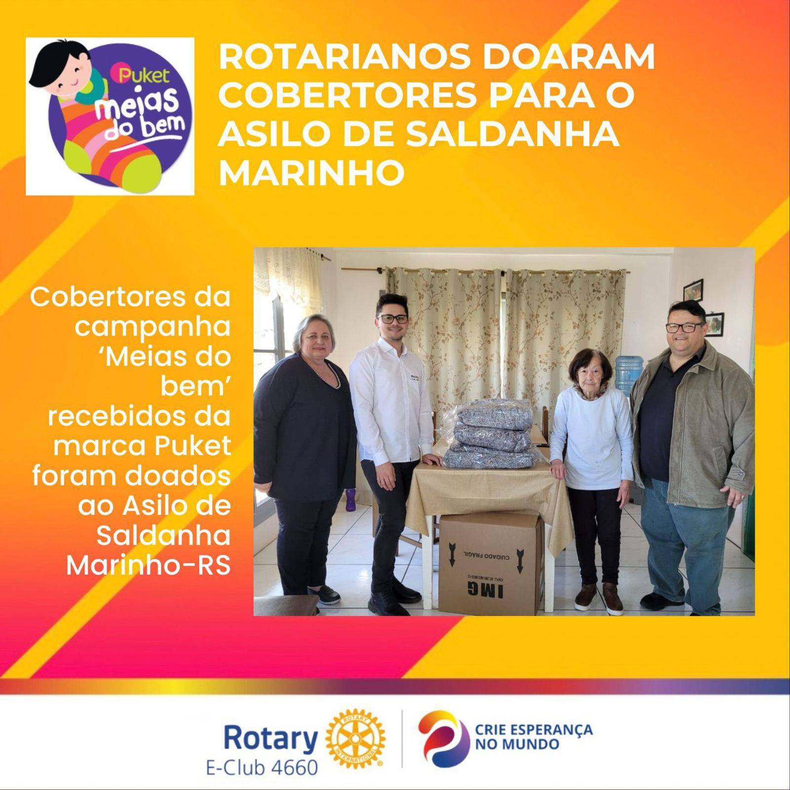 Cobertores recebidos através do projeto "Meias do Bem" da Marca Puket foram doados ao asilo de Saldanha Marinho-RS. A marca recolhe meias usadas e tranforma em cobertores quentinhos para quem precisa. O clube parabeniza a marca Puket pelo projeto e é parceiro nesta causa. Você também pode apoiar doando suas meias velhas ou sem par, basta procurar um dos rotarianos do Rotary E-Club 4660. Fazer o bem nunca foi tão fácil!