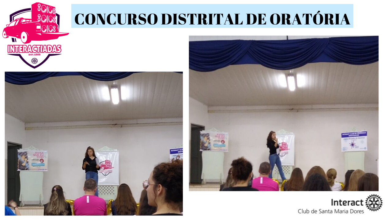 Durante os dias 5 e 6 de outubro, ocorre na cidade de Frederico Wesphalen o evento Interactíadas, e o Interact Club de Santa Maria Dores está participando. No dia de hoje, 5 de outubro, já participamos do Concurso de Oratória do Distrito 4660, representados pela companheira Helena Larré.