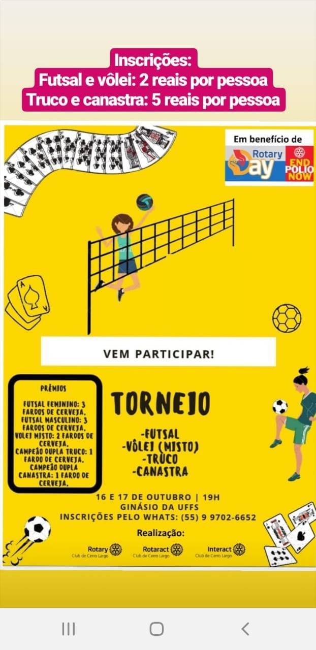 Nos dia 16 e 17 de outubro de 2019 o Rotary, o Rotaract e o Interact promoveram um Torneio Esportivo, com o intuito de arrecadar recursos para a Fundação Pólio Plus. Participaram das modalidades Canastra, Truco e Futsal Feminino e Masculino mais de 200 pessoas. A ação, que aconteceu no Ginásio da Universidade Federal da Fronteira Sul, fez parte das atividades da família rotária Cerro-larguense em virtude do Rotary Day.