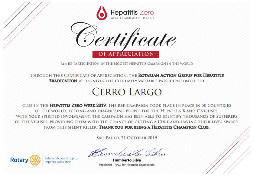 O Rotary Club de Cerro Largo recebeu seu certificado de participação no programa Hepatite Zero, projeto este realizado em julho deste ano, quando foram realizados 600 testes rápidos para detecção da hepatite C na população local.
