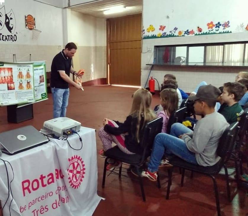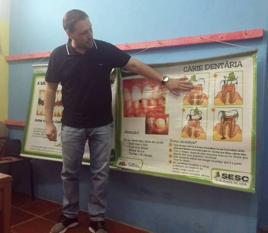 O profissional dentista Eduardo Zart, explanou para as crianças sobre a importância de manter uma boa higiene bucal, também demonstrou como escovar os dentes adequadamente e ao final as crianças receberam escovas dentais e creme dental ????????