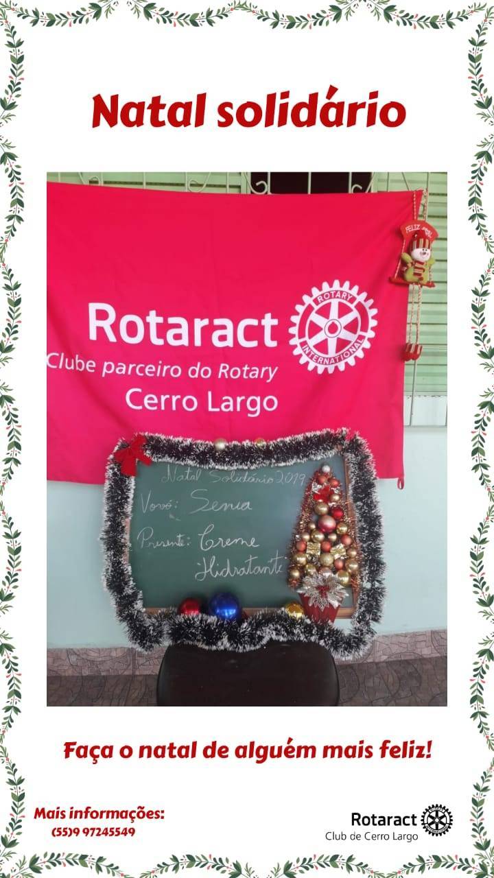 Devido ao sucesso do projeto "Natal solidário 2018", realizado com o intuito de presentear os idosos moradores do Lar do Idoso de Cerro Largo, membros da Diretoria da casa entraram em contato com o Rotaract para repetirem o projeto em 2019. A principal ação do projeto é a arrecadação de presentes solicidados pelos sonhores e senhoras que residem no Lar. Tamabém, ao divulgar nas redes sociais as fotos com os pedidos, o clube entende que chama a atenção da população para os idosos e, desta forma, possibilita a adesão de novos voluntários para fazerem visitar e alegrarem a vida dos vovôs e das vovós do lar.