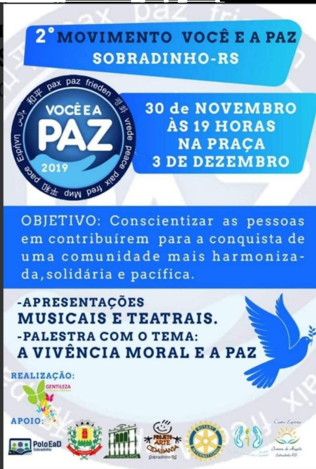 Ja está sendo divulgado o 2° Movimento "Você e a Paz". Des de o ano passado o Rotary Club de Sobradinho participa, e esse ano, conta com o auxílio do Interact. O evento acontece em 30 de novembro, na Praça 3 de Dezembro, de Sobradinho. Todos são convidados a contribuir e participar desse grandioso evento!!!