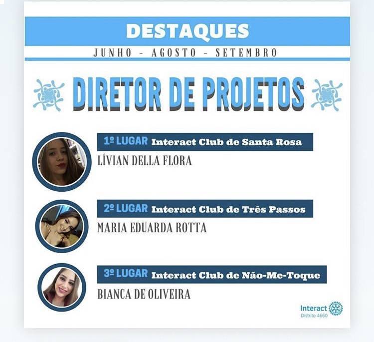 A companheira Livian Della Flora ficou 1° Lugar entre as diretoras de projetos do Distrito 4660 no trimestre. Entre os critérios estavam organização, pontualidade, cumprimento de prazos e engajamento nos projetos. Estamos felizes e orgulhosos, parabéns!!