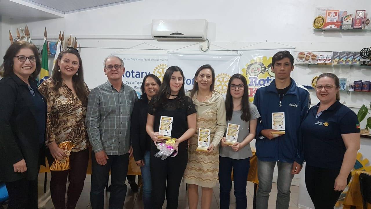 Na reunião do dia 23 de Outubro, aconteceu a premiação do 20° Concurso de Redação promovido pelo Rotary Club de Tupanciretã no Instituto Estadual Educacional Mãe de Deus. Este ano o tema de redação fpo: "A INFLUÊNCIA DA MÚSICA NO COMPORTAMENTO DOS JOVENS". Os vencedores receberam o livro do escritor Tupanciretanense Belquer Ubirajara da Silva Lopes, intitulado "Peregrinando Rumo a Finisterra", o qual se fez presente na reunião e agradeceu ao Rotary pela realização do concurso e parabenizou os alunos e a escola pelas redações. Estiveram presentes a Diretora Carmem Regina Genro e as Professoras Zilda Koch e Vania de Lima Dias. A classifocação final foi a seguinte: