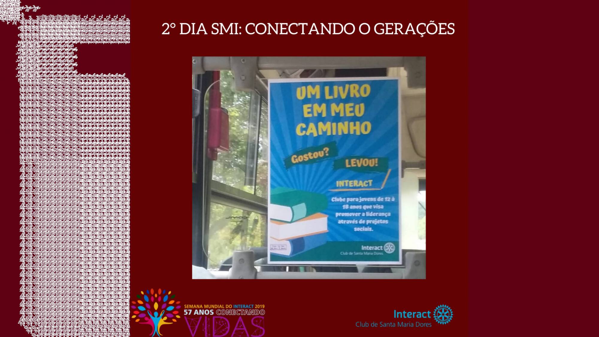 No 2º dia , foi proposto uma festiva para concetar as gerações e comemorar os 57 anos da fundação do primeiro Interact Club. Então, na sexta-feira dia 1°, foi realizado uma festiva na casa da conselheira de Interact juntamente com alguns sócios do clube e um rotaractiano. Nela, os presentes organizaram os livros para o projeto "Um Livro em Meu Caminho".