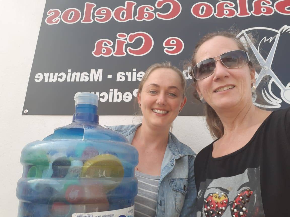 Companheira Simone arrecadando as tampinhas no Salão de Beleza Cabelos e cia da Lenara Carlotto.