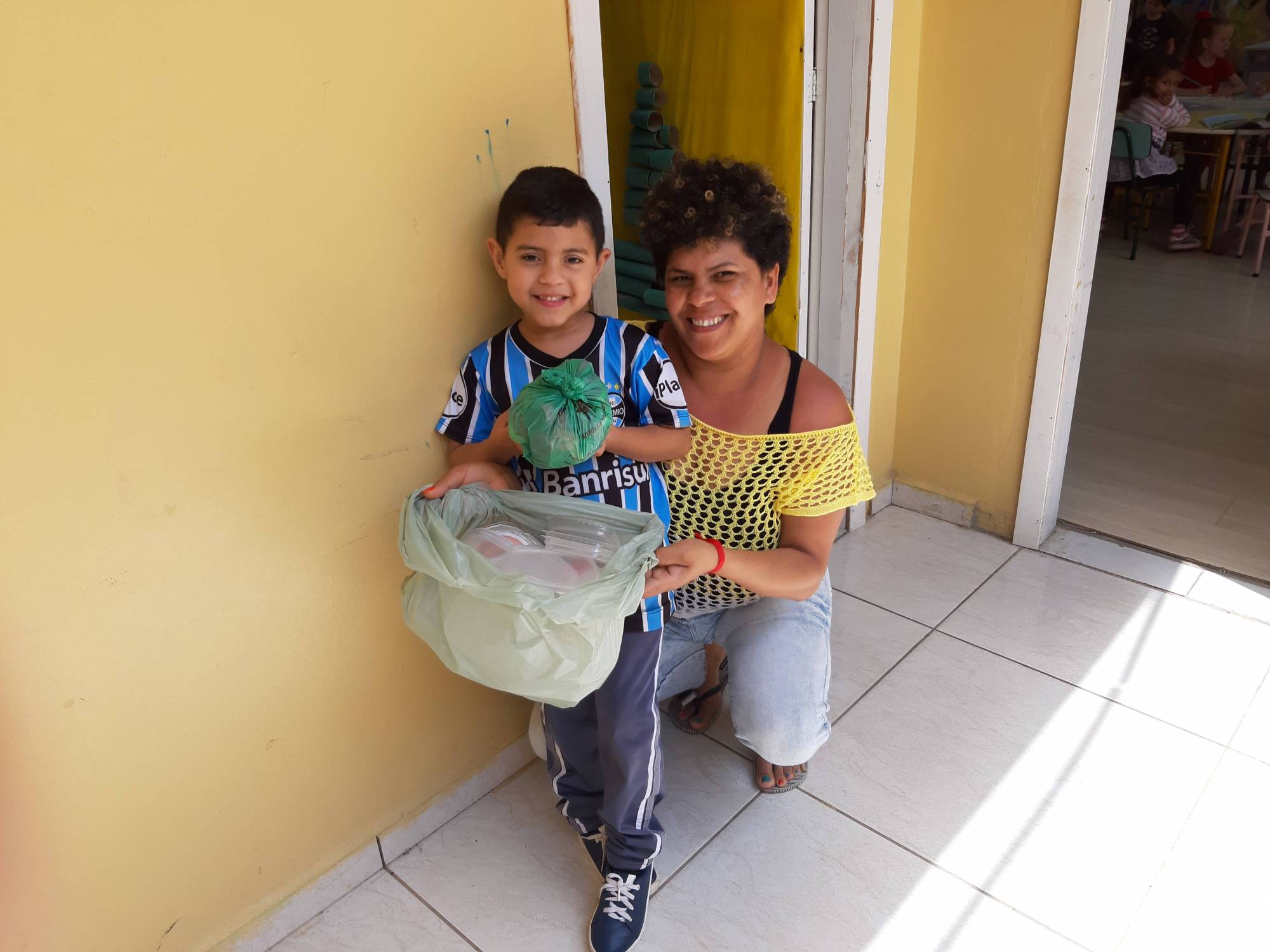 A avó Rose da Silva, ja está ensinando o neto Victor da Silva, de 4 anos, a guardar as tampinhas de refrigerante e as tampas de pote, para doar ao Rotary. Assim ao desocupar os litros e potes, doa para o Rotary separar por cor, e vender na Usina de reciclagem. Cada um fazendo a sua parte e ajudando o meio ambiente.