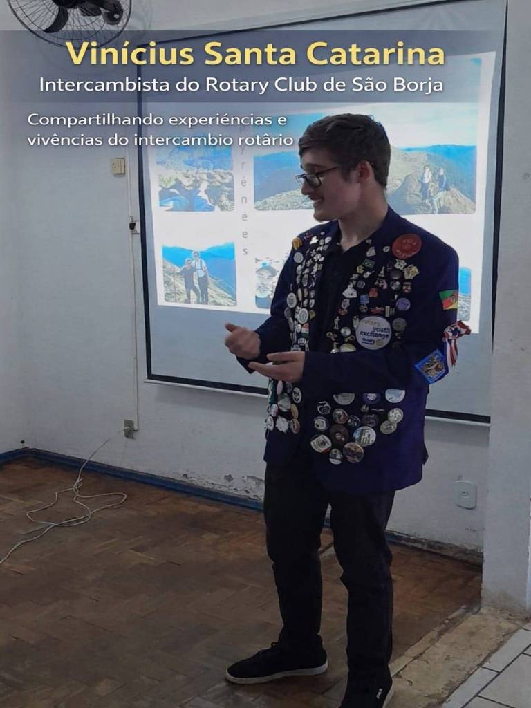 Vinícius Santa Catarina, intercambista do Rotary Club de São Borja e filho do nosso companheiro Jairo Santa Catarina, destaca-se pelo comprometimento com os valores rotários. Atuou no Projeto Educar – Alfabetização para Idosos, desenvolvido pelo Rotary Club de São Borja Norte, contribuindo de forma significativa para a educação, a inclusão social e o fortalecimento da cidadania. No dia 30/01, foi realizada uma roda de conversa com o intercambista junto ao grupo de alunas do Projeto Educar, promovendo a troca de experiências, o diálogo e o aprendizado mútuo. Sua participação reflete, de maneira exemplar, o verdadeiro espírito rotário: Dar de Si Antes de Pensar em Si.