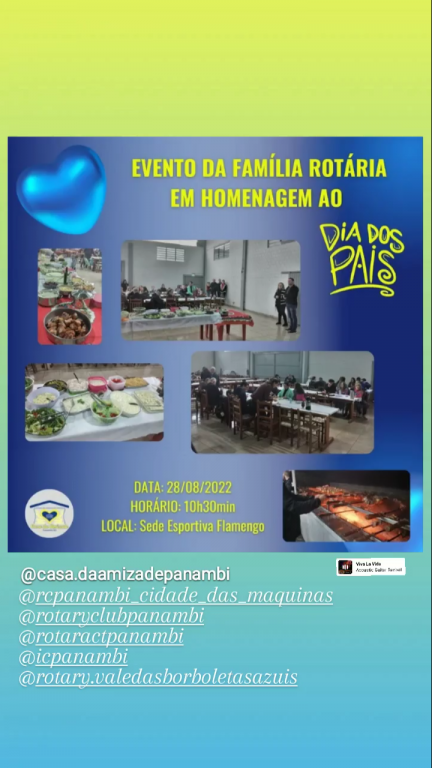 Seguindo o calendário de Reuniões, no dia 28/08 aconteceu nas dependências do Campo do Flamengo, o almoço festivo alusivo ao Dia dos Pais. Mesmo com chuva e muito frio os companheiros e seus familiares não deixaram de ir e prestigiar o excelente almoço que foi preparado e servido naquele dia. Organizado pela Casa da Amizade e Rotary Club de Panambi, a família rotária, mais uma vez esteve reunida e teve a oportunidade, para desfrutar de belos momentos de descontração e integração.