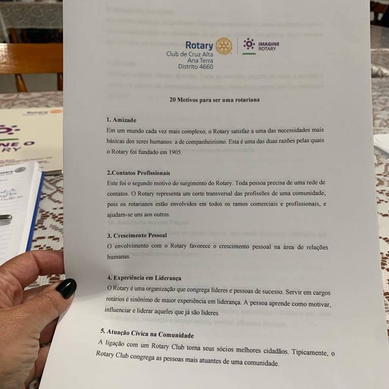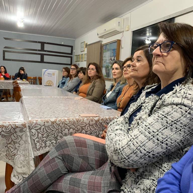 Na noite de terça-feira (27/09), realizamos a Reunião de Sensibilização para pessoas especiais: Emilady Malheiros convidada pela Maria Lúcia Jacques de Oliveira; Elenir Facco de Bortoli convidada por Ivania Librelotto e Claudia Pacheco convidada de Angélica Copetti. A companheira Maria Lúcia apresentou informações importantes sobre o Rotary, bem como os projetos desenvolvidos pelo nosso clube e atribuições de uma rotariana. Depois as companheiras se apresentaram e relataram o valor do Rotary em suas vidas. As convidadas ficaram encantadas pelo que ouviram e manifestaram interesse em pertencer ao clube. Portanto, mais Anas Terra estão chegando para somar esforços pelo bem comum de nossa comunidade. Sejam muito bem-vindas Emilady, Elenir e Claudia.