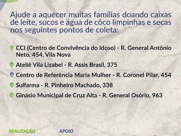 O Projeto Cruz Alta Sem Frestas contemplou mais uma família cruz-altense. O projeto tem três princípios: segurança das famílias, já que protege do frio, calor e bichos; ambiental, pois reutiliza as caixas de leite e o social, pois oferece aconchego e comodidade às famílias. Quer participar desse projeto? Doe caixas limpas e secas: Ginásio Municipal; Sulfarma; Centro de Referência do Idoso; Ateliê Vila Lizabel e Centro de Referência Maria Mulher.
