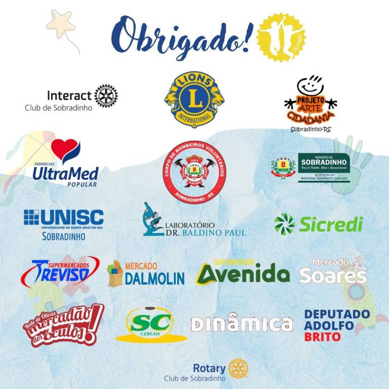 Apoio: Unisc Sobradinho, Supermercados Treviso, Mercado Dalmolin, Supermercado Avenida, Mercado Soares, Sicredi, Laboratório Dr. Baldino Paul, Mercadão dos Óculos Sobradinho, SC Cereais, Dinâmica.