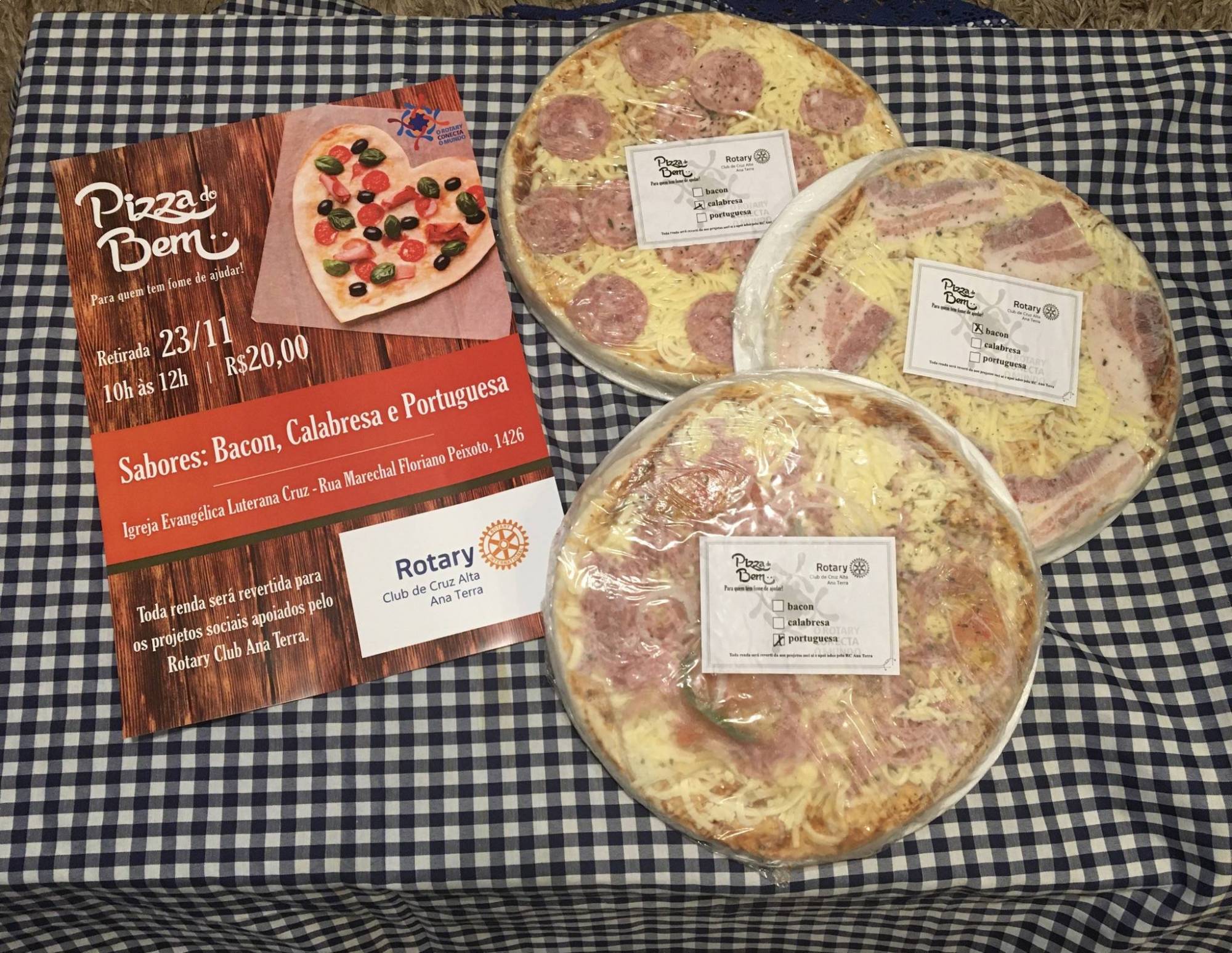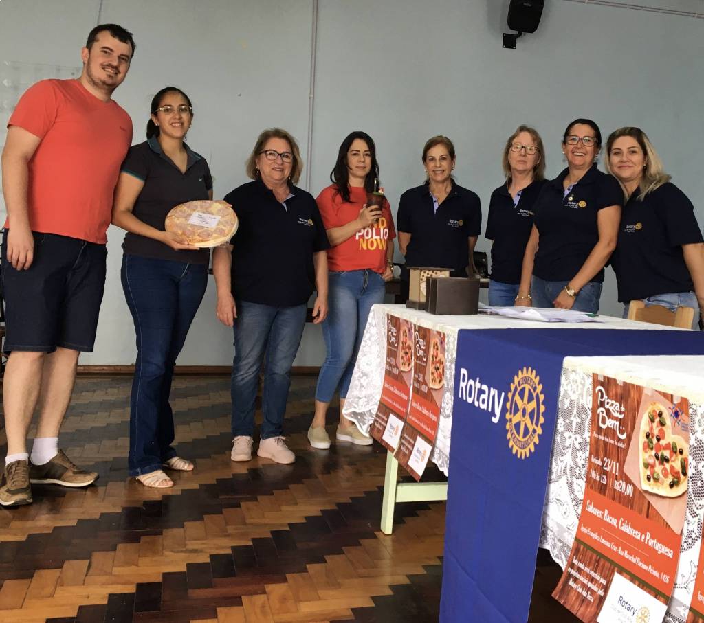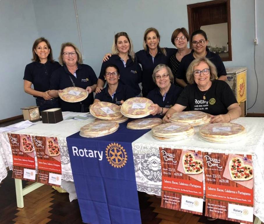Pizza do Bem é um dos projetos realizados pelo Rotary Club Ana Terra, em Cruz Alta. Visa arrecadar recursos para enviar à Fundação Rotária, bem como custear despesas com outros projetos apoiados pelo Rotary. Nessa sábado, 23 de novembro, as rotarianas reuniram-se na Igreja Evangélica Luterana Cruz para fazer a entrega das pizzas, que foram antecipadamente comercializadas. As vendas superaram as expectativas, os compradores elogiaram a ideia e por isso o projeto Pizza do Bem obteve êxito. Para quem tem fome de ajudar é uma ótima oportunidade para contribuir com o Rotary Club Ana Terra e ainda degustar uma saborosa pizza. As rotarianas agradecem o apoio da comunidade cruz-altense e sentem-se motivadas a fazer o bem sem olhar a quem.