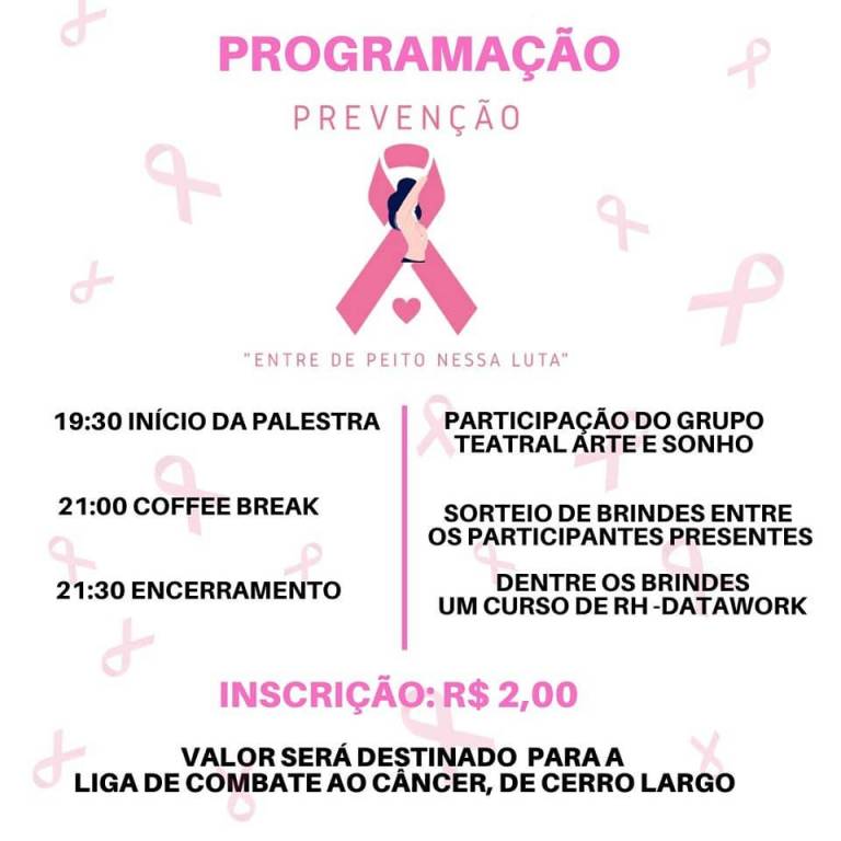 Outubro é conhecido mundialmente como um mês no qual se intensificam as campanhas que visam estimular a luta contra o câncer de mama e seu diagnóstico precoce. Como forma de promover a conscientização sobre essa doença, o Rotaract Club de Cerro Largo, juntamente com a Clínica Cuidador e o Grupo Teatral Arte e Sonho, com o apoio da Universidade Federal da Fronteira Sul (UFFS), planejou uma palestra que ministrada pela Enfermeira Ana Paula Theis Figueiredo e pela Psicóloga Izabel Hackenhaar. A palestra ocorreu no dia 29 de outubro, às 19h30min, no Auditório do Bloco A da UFFS campus Cerro Largo. Também na ocasião foram sorteados brindes às mulheres presentes.