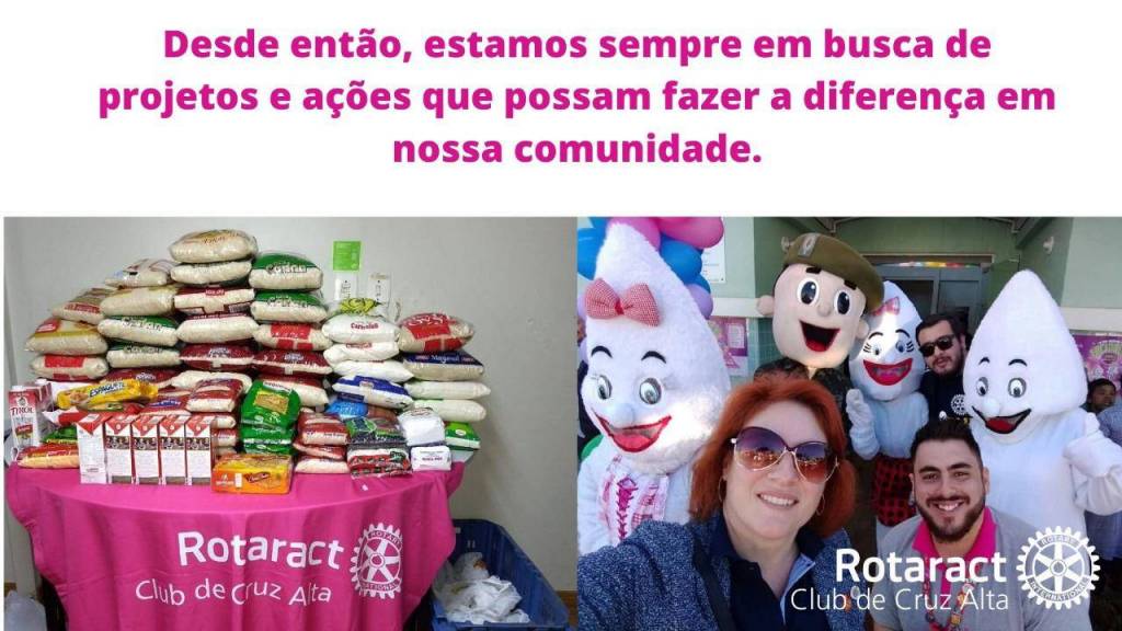 Dos projetos realizados pelo clube podemos destacar: as campanhas de doação de sangue junto ao Hemocentro de Cruz Alta; as Oficinas de Páscoa que nesses dois anos envolveram mais de 100 crianças do EMEI Antenor Funck; O Brincando com o Rotaract que nas duas edições ofereceu a mais de 250 crianças uma tarde de brincadeiras, lanches e recreação; e o projeto de arrecadação de materiais para a volta às aulas que em 2018 arrecadou mais de 1000 itens escolares, distribuídos nos CRAS de nossa cidade. Todas essas ações contam com o apoio de pessoas e empresas parceiras, peças fundamentais para que os projetos alcancem os resultados desejados.