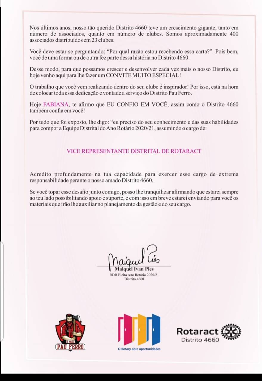 Companheira em dupla associação, recebe convite para integrar a equipe Distrital do Rotaract, na gestão 2020/2021