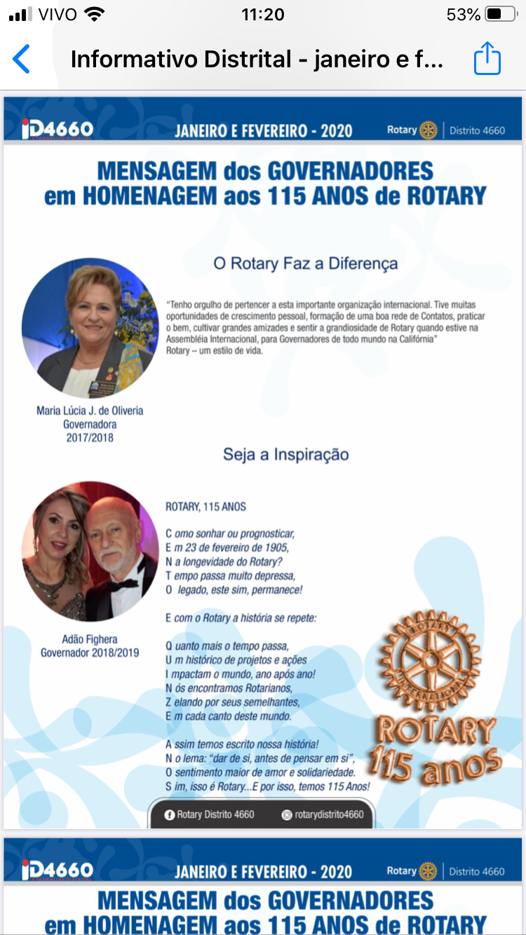 A companheira Maria Lúcia, governadora do distrito 4660 na gestão 2017/2018, deixa mensagem pelo aniversário de 115 anos do Rotary Internacional no Informativo Distrital. Orgulho para todas companheiras do RC Ana Terra.
