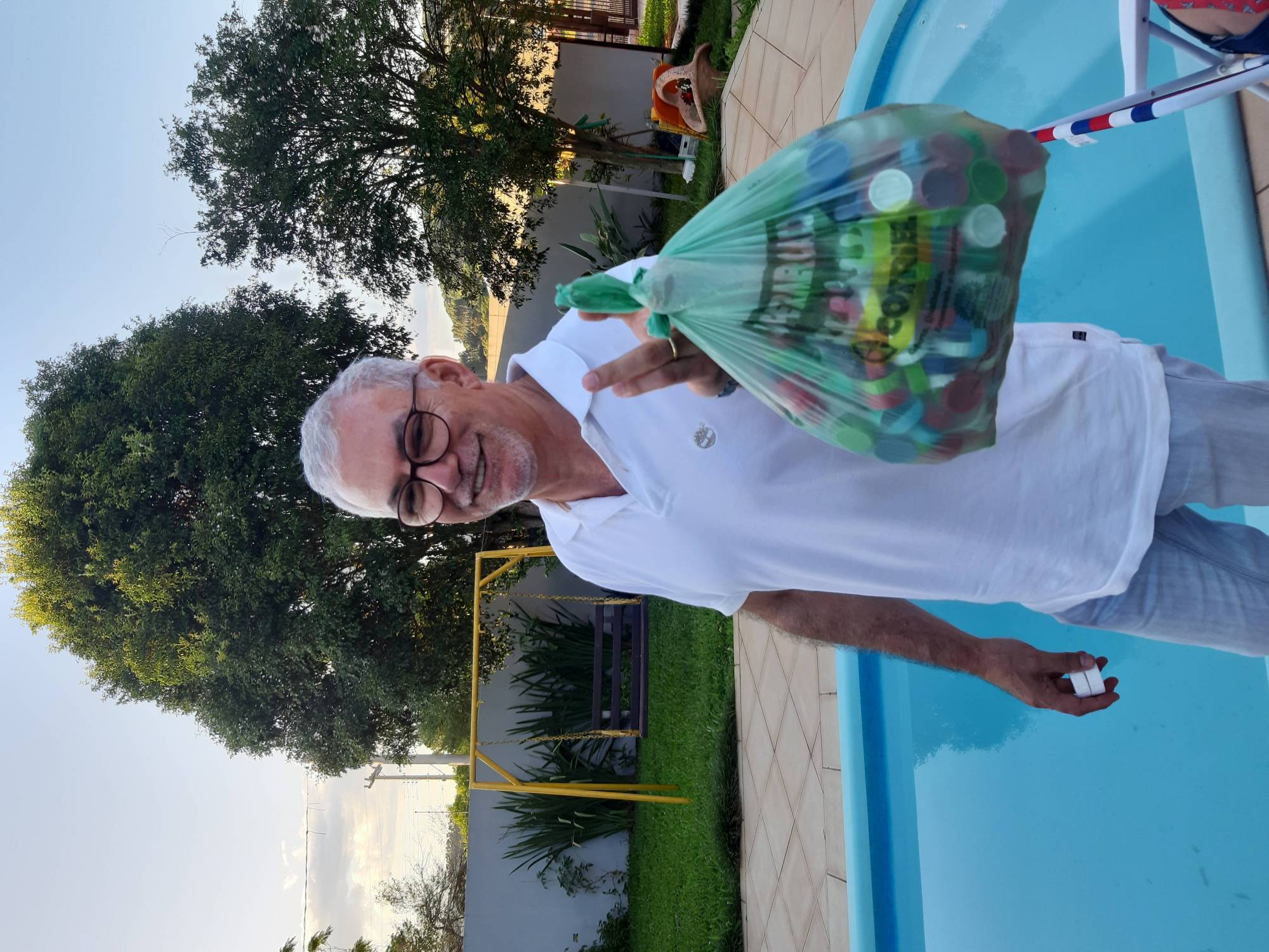 O rotariano Pedro Prá trouxe um saco de tampinhas que o colega de profissão Dr Jorge Seitenfus recolhe quando realiza suas corridas.