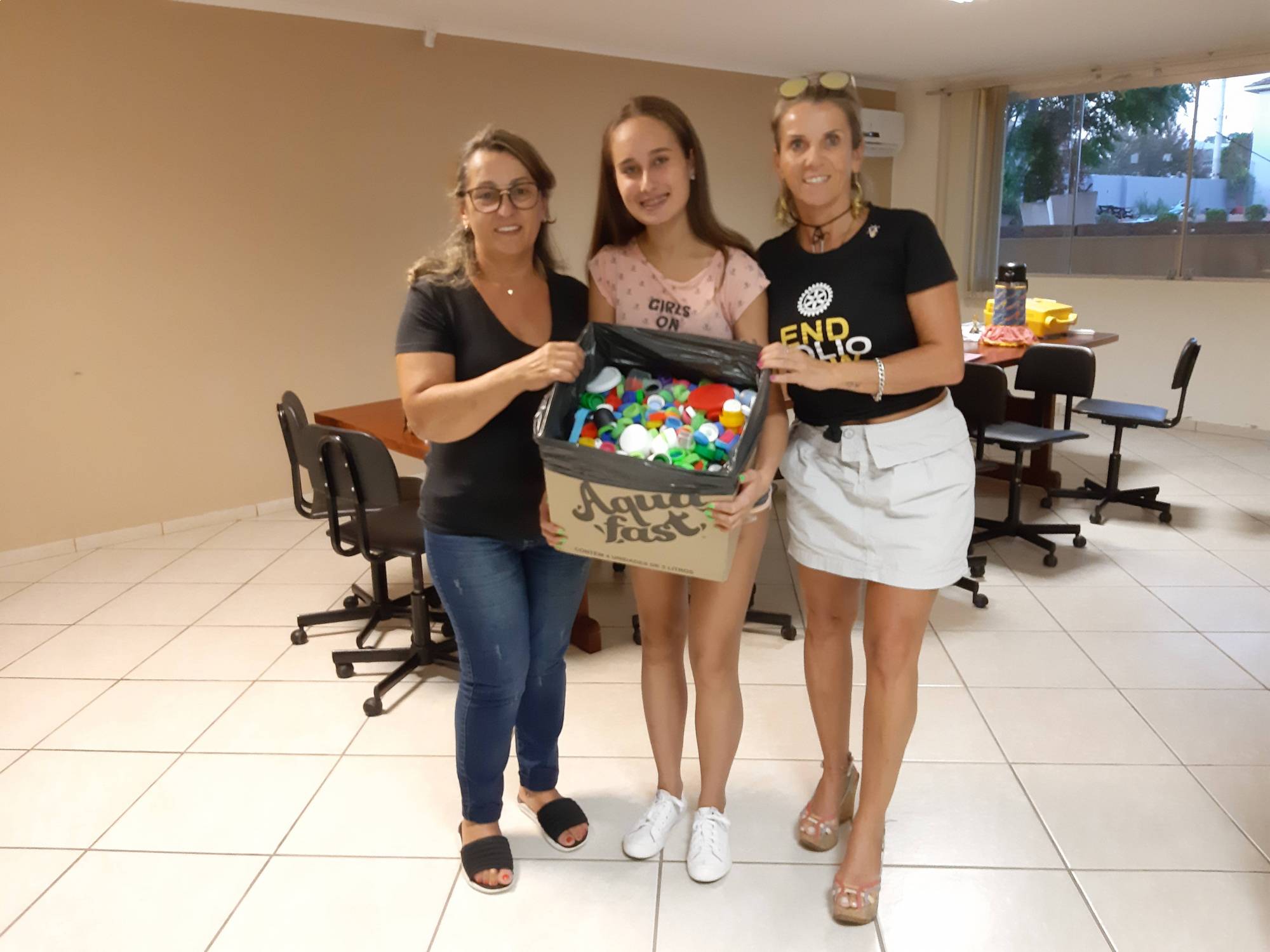 A interactiana Bibiana Cides, de 15 anos, trouxe uma caixa cheia de tampinhas que coletou entre os familiares, tanto na sua casa, como na da vó, dos tios.