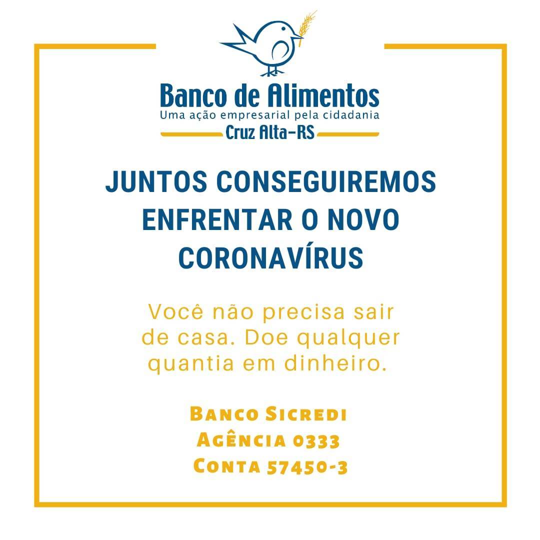Como não podemos realizar o Sábado Solidário devido às restrições estabelecidas pelas autoridades de saúde, tememos o desabastecimento e a falta de suprimentos para atender as instituições que, mensalmente contam com a ajuda do Banco de Alimentos. Dessa forma, estamos divulgando a nossa conta bancária para que cada um, dentro das suas possibilidades, possa ajudar o Banco de Alimentos de Cruz Alta a cumprir com o seu objetivo: COMBATER FOME
