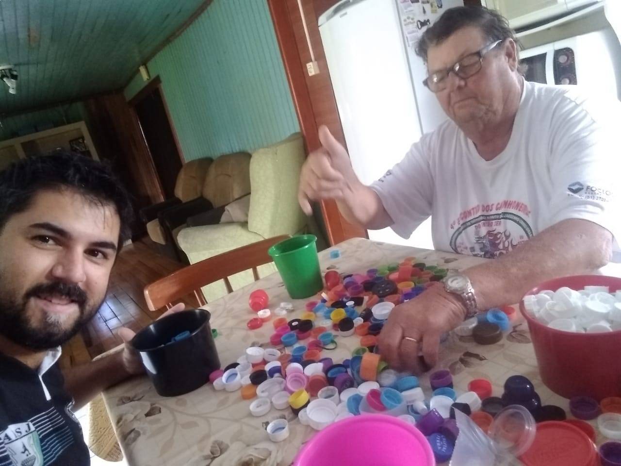 O companheiro Rian Loppez, contou com a ajuda do sogro, seu Scotta para separar as tampinhas em Arroio do Tigre.