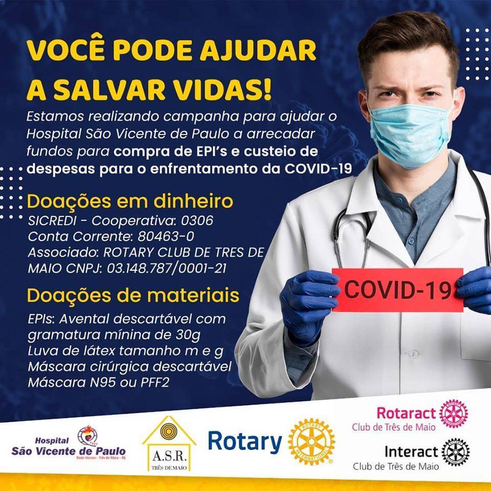 Diante da pandemia do novo Coronavírus o Rotaract Três de Maio criou esta ação, que agora conta com o apoio da nossa Família Rotária (Rotary Club, Interact e Casa da Amizade), de maneira a requisitar o auxílio da comunidade para o combate à Covid-19. Esta campanha busca arrecadar recursos financeiros e materiais de Proteção Individual (EPI) para o Hospital São Vicente de Paulo (frente a grande demanda destes materiais, os mesmos encontram-se em falta).
