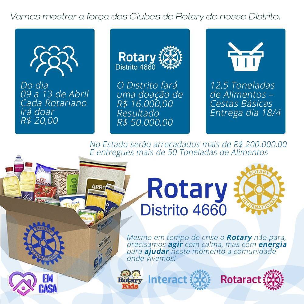 A ação que envolve nosso distrito, prevê uma doação de $20,00 por rotariano, o Distrito fará uma doação de $16 mil reais, resultando $ 50 mil reais, totalizando 12,5 TONELADAS DE ALIMENTOS- Cestas básicas. Tendo uma entrega prevista para o dia 18 de abril, podendo ser a data transferida dependendo do Clube.