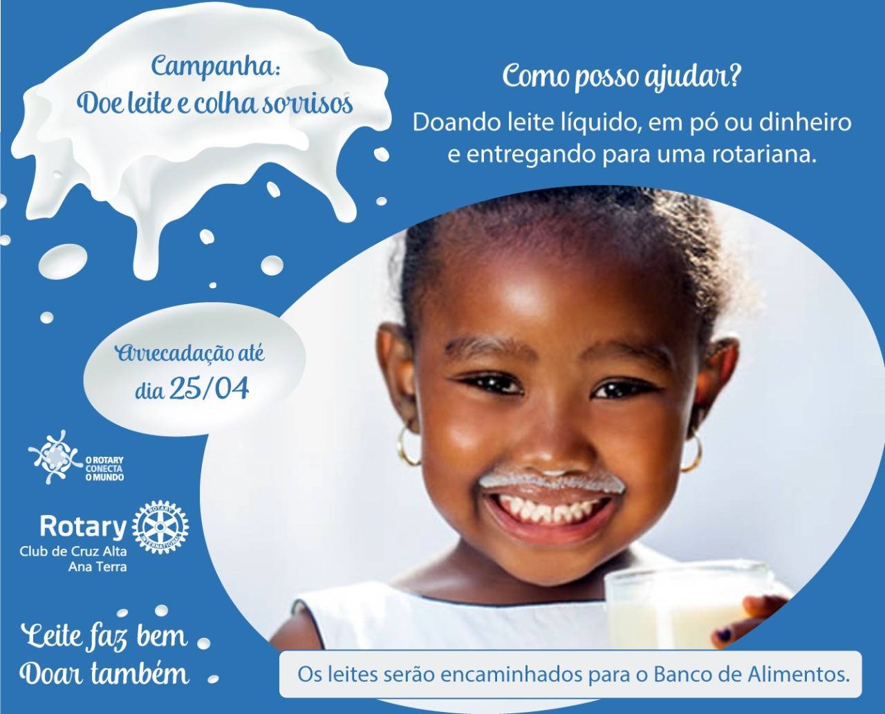 O RC de Cruz Alta Ana Terra está promovendo a campanha “Doe leite, colha sorrisos”, com intuito de arrecadar qualquer tipo de leite. As doações serão recolhidas pelas rotarianas até o dia 25 de abril e encaminhadas ao Banco de Alimentos. Leite faz bem. Doar também! Participe dessa campanha e ajude a manter o sorriso de crianças carentes. Qualquer dúvida estamos à disposição! Rotary é isso!