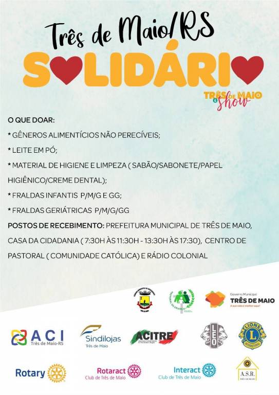 O #Governo Municipal de Três de Maio juntamente com os clubes de serviços do município criaram o #projeto “Três de Maio Solidário”. O projeto tem como objetivo a elaboração de um #programa para regular e normatizar o #atendimento a população mais vulnerável e em risco social em função da pandemia do #coronavírus. ?? .