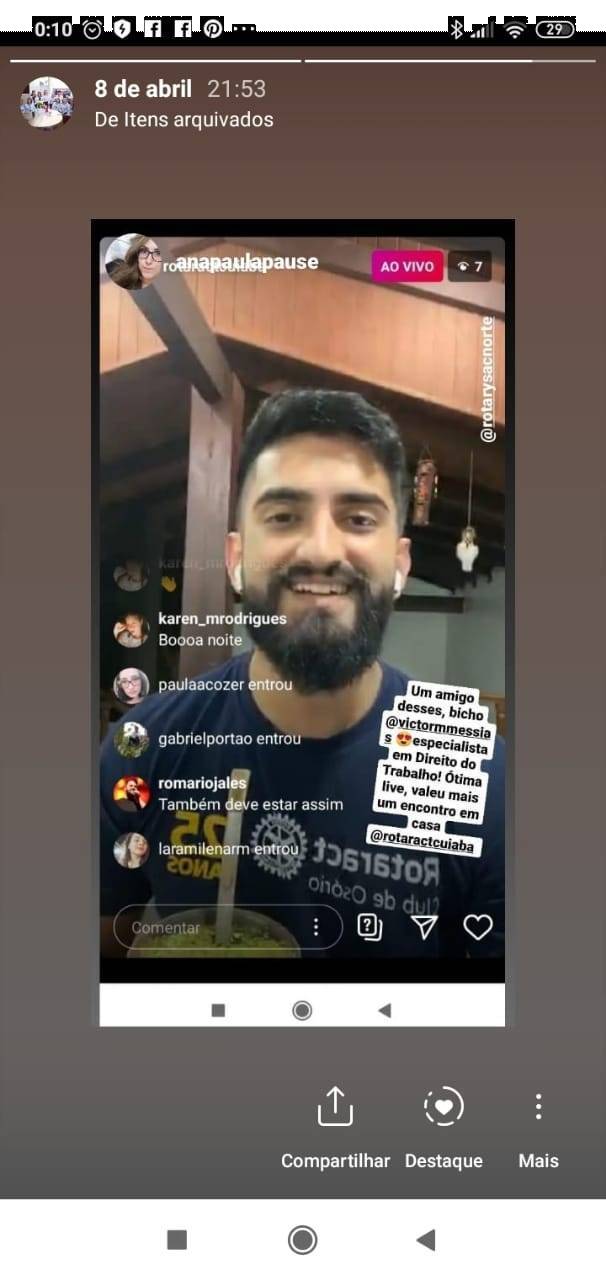 Na noite de hoje, a companheira Ana Paula, esteve acompanhando mais um encontro em casa, realizado pelo Rotaract de Cuiabá, através de live via Instagram, com o tema sobre as mudanças no Direito do Trabalho, em tempos de pandemia. O facilitador foi Victor Messias, Companheiro do Rotaract Club de Osório.