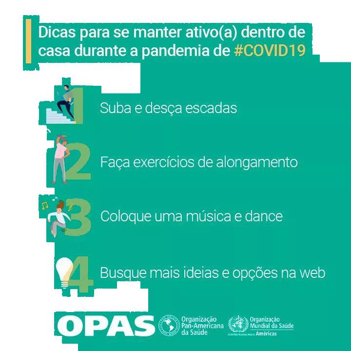 A Organização Pan-Americana da Saúde, organizou esse card, com algumas opções de atividade física, sem sair de casa.